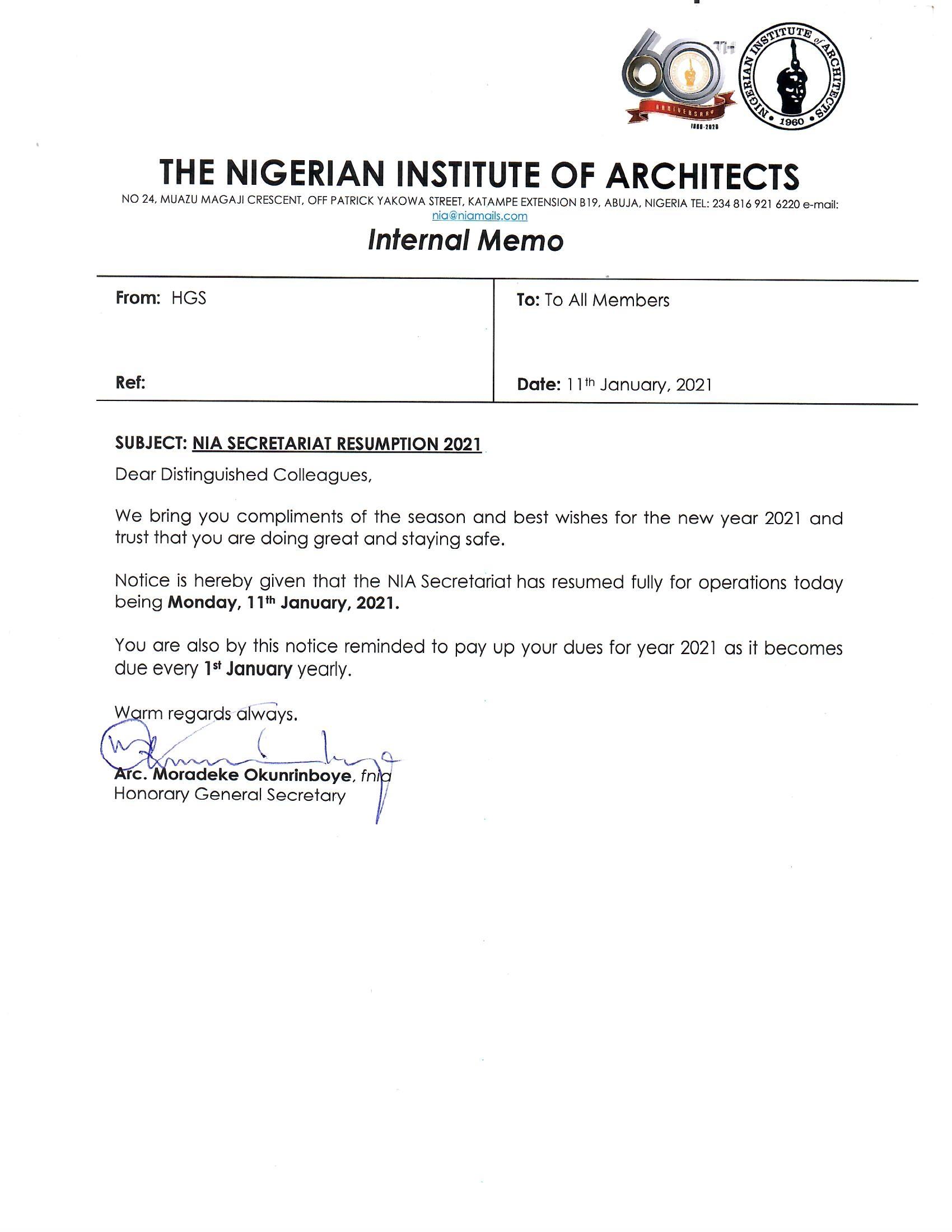 Notice is hereby given that the NIA Secretariat has resumed fully for operations today being Monday, 11th January, 2021.